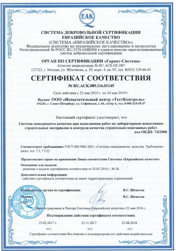 В мае 2016 года строительная лаборатория ООО "ИЦ"ТестКонтроль" успешно прошла добровольную сертификацию на соответствие требованиям системы менеджмента качества ГОСТ ISO 9001-2011 "Системы менеджмента качества. Требования" по системе "Евразийское качество". Сетрификат соответствия№RU.АСК.089.116.01145 от 25.05.2016г. Сертификат действителен сроком на 4 года.
